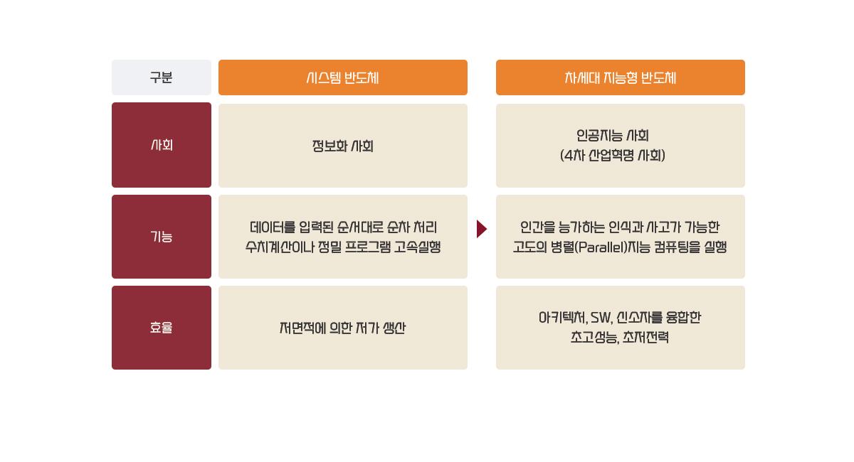 - 4차 산업혁명 사회가 요구하는 인공지능 컴퓨팅에 의한 인지능력의 비약적 향상, 계산처리 능력의 효율화, 정보 활용의 고신뢰성을 실현할 수 있는 차세대 지능형 반도체가 요구