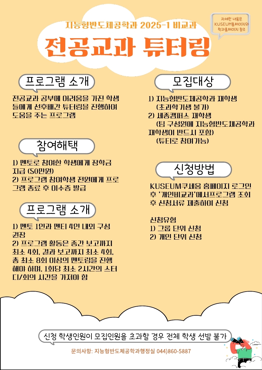 지능형반도체공학과에서는 재학생들의 전공교과 능력을 향상시키기 위해 선후배간 멘토링 프로그램을 지원하고자 합니다. 이를 통하여, 선후배 사이의 학문적 유대감을 증진시키고, 전공교과 능력을 활용하여 심화전공 학습 능력을 향상시키고자합니다. 이에, 재학생들을 대상으로 지능형반도체공학과에 개설된 전공교과목에 출중한 멘토와 해당 능력의 향상을 필요로 하는 멘티를 모집합니다.