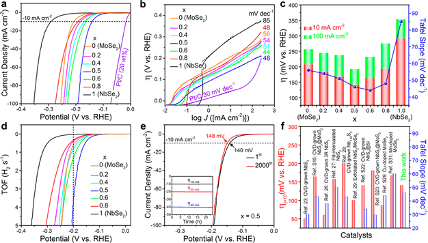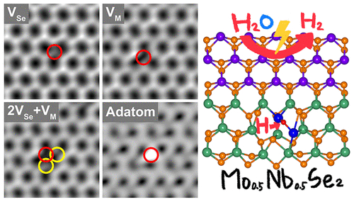 Abstract: Earth-abundant transition metal dichalcogenide nanosheets have emerged as an excellent catalyst for electrochemical water splitting to generate H2. Alloying the nanosheets with heteroatoms is a promising strategy to enhance their catalytic performance. Herein, we synthesized hexagonal (2H) phase Mo1-xNbxSe2 nanosheets over the whole composition range using a solvothermal reaction. Alloying results in a variety of atomic-scale crystal defects such as Se vacancies, metal vacancies, and adatoms. The defect content is maximized when x approaches 0.5. Detailed structure analysis revealed that the NbSe2 bonding structures in the alloy phase are more disordered than the MoSe2 ones. Compared to MoSe2 and NbSe2, Mo0.5Nb0.5Se2 exhibits much higher electrocatalytic performance for hydrogen evolution reaction. First-principles calculation was performed for the formation energy in the models for vacancies and adatoms, supporting that the alloy phase has more defects than either NbSe2 or MoSe2. The calculation predicted that the separated NbSe2 domain at x = 0.5 favors the concurrent formation of Nb/Se vacancies and adatoms in a highly cooperative way. Moreover, the Gibbs free energy along the reaction path suggests that the enhanced HER performance of alloy nanosheets originates from the higher concentration of defects that favor H atom adsorption.