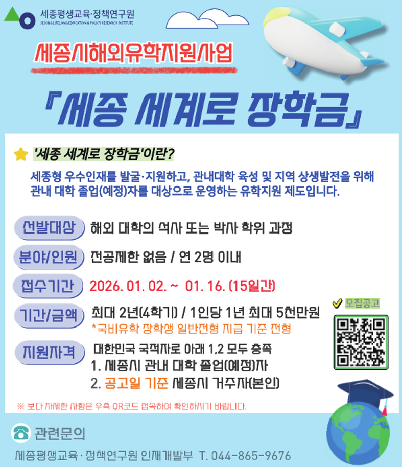 [안내] 2026년 세종 세계로 장학금 세종시 해외유학생 선발 신청기간 안내