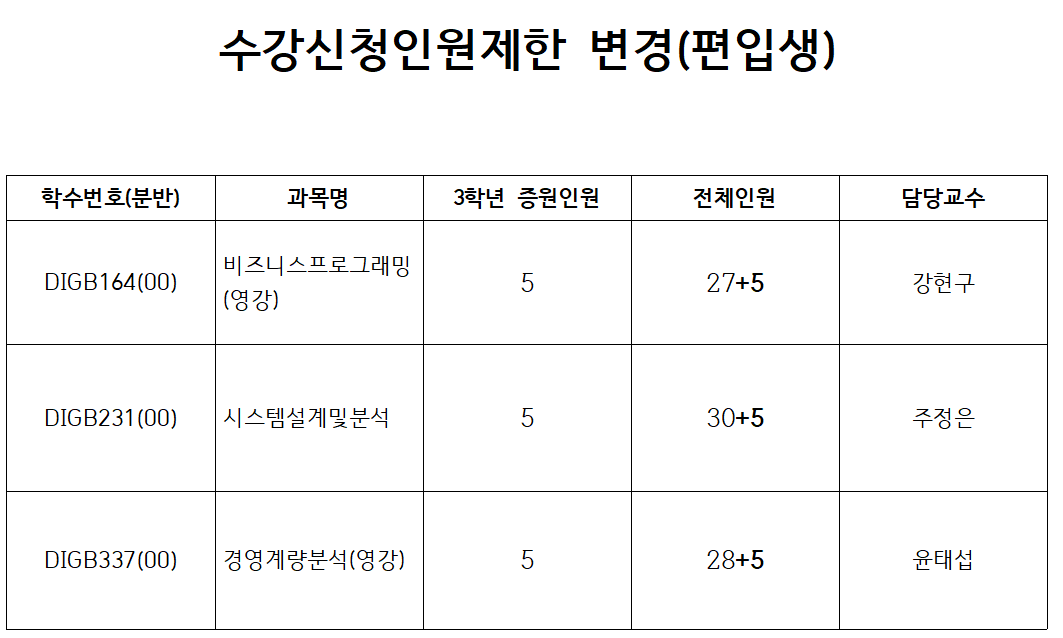 편입생 수강신청을 위한 인원 증원 안내입니다.
