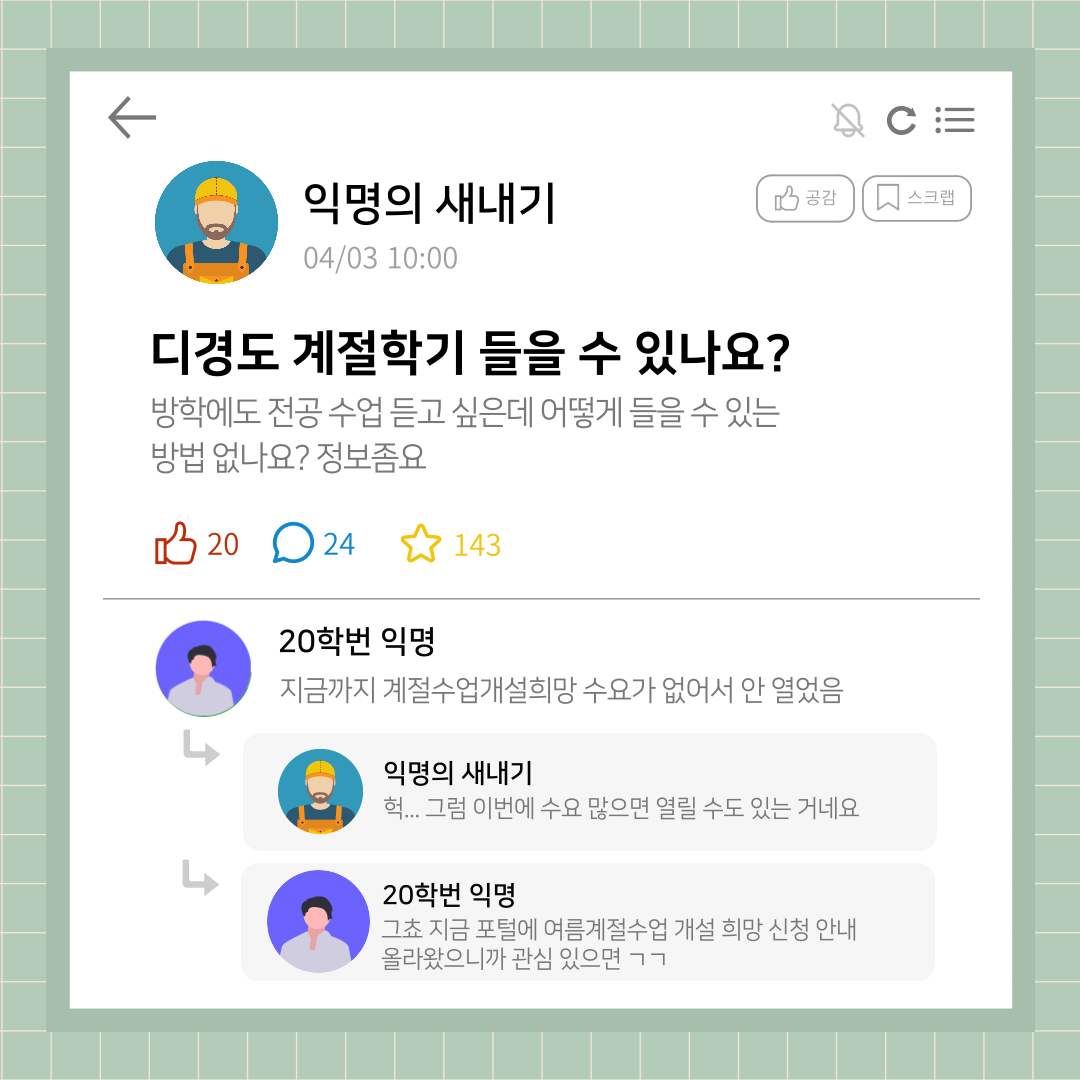 2024학년도 여름계절수업 개설 희망교과목을 파악하여 교과목 개설에 참고하고자 "2024학년도 여름계절수업 개설 희망 교과목 신청"을 아래와 같이 실시하오니, 희망하는 학생들은 참고 바랍니다.