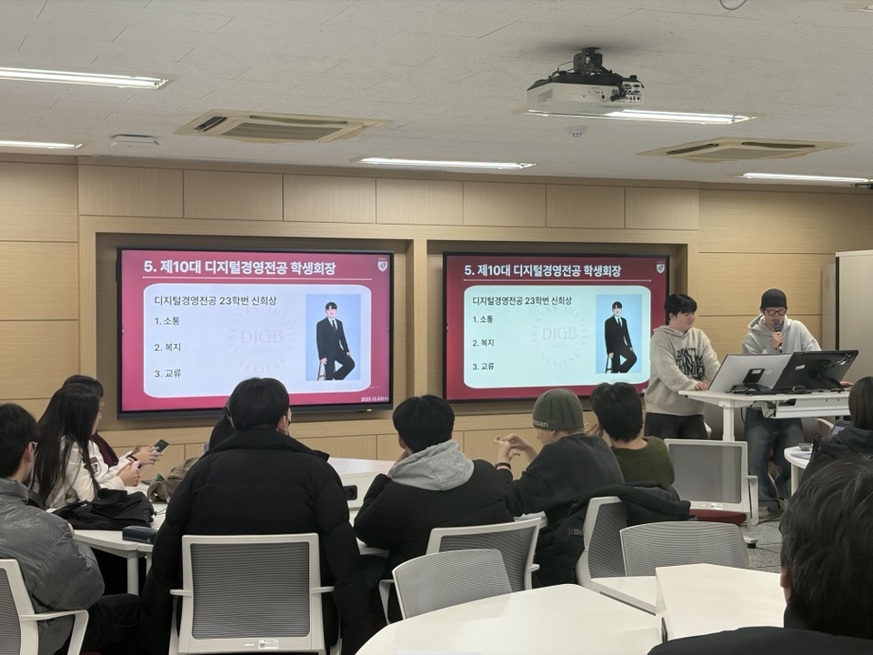 이번 종강총회는 조제연 학생회장님께서 진행을 맡아 주셨으며, 이와 함께 내년 제10대 디지털경영전공 학생회장 소개도 이루어졌습니다.