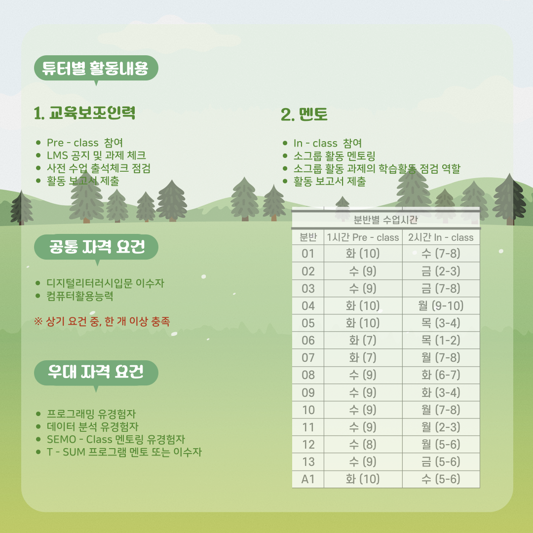 멘토 지원자는 2시간 In-class와 본인의 수업 시간이 중복되지 않아야 합니다.
