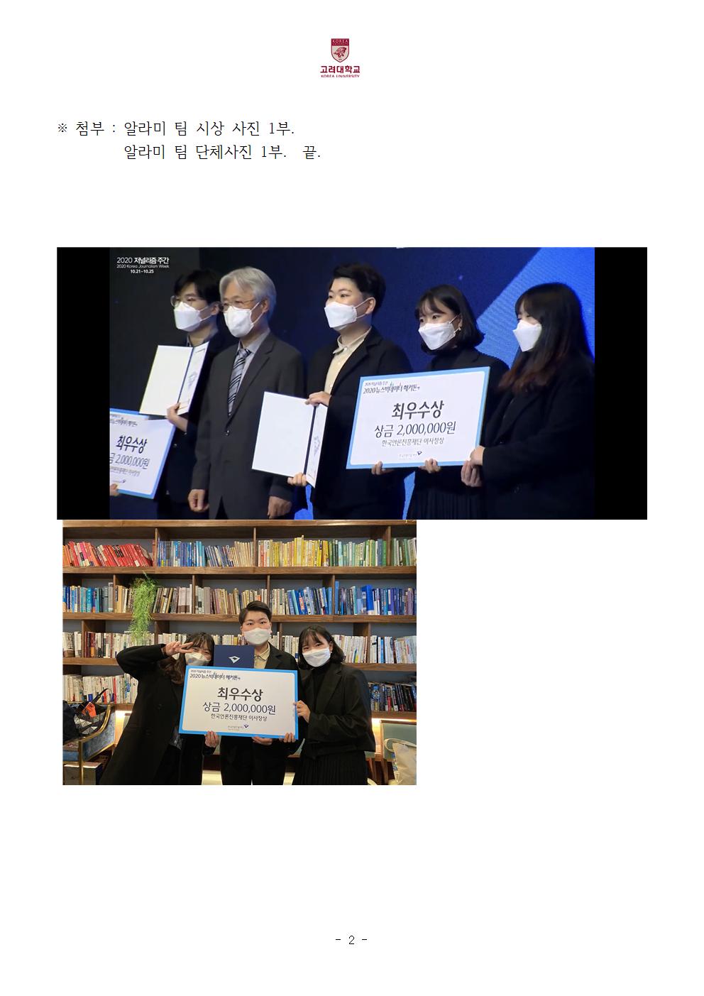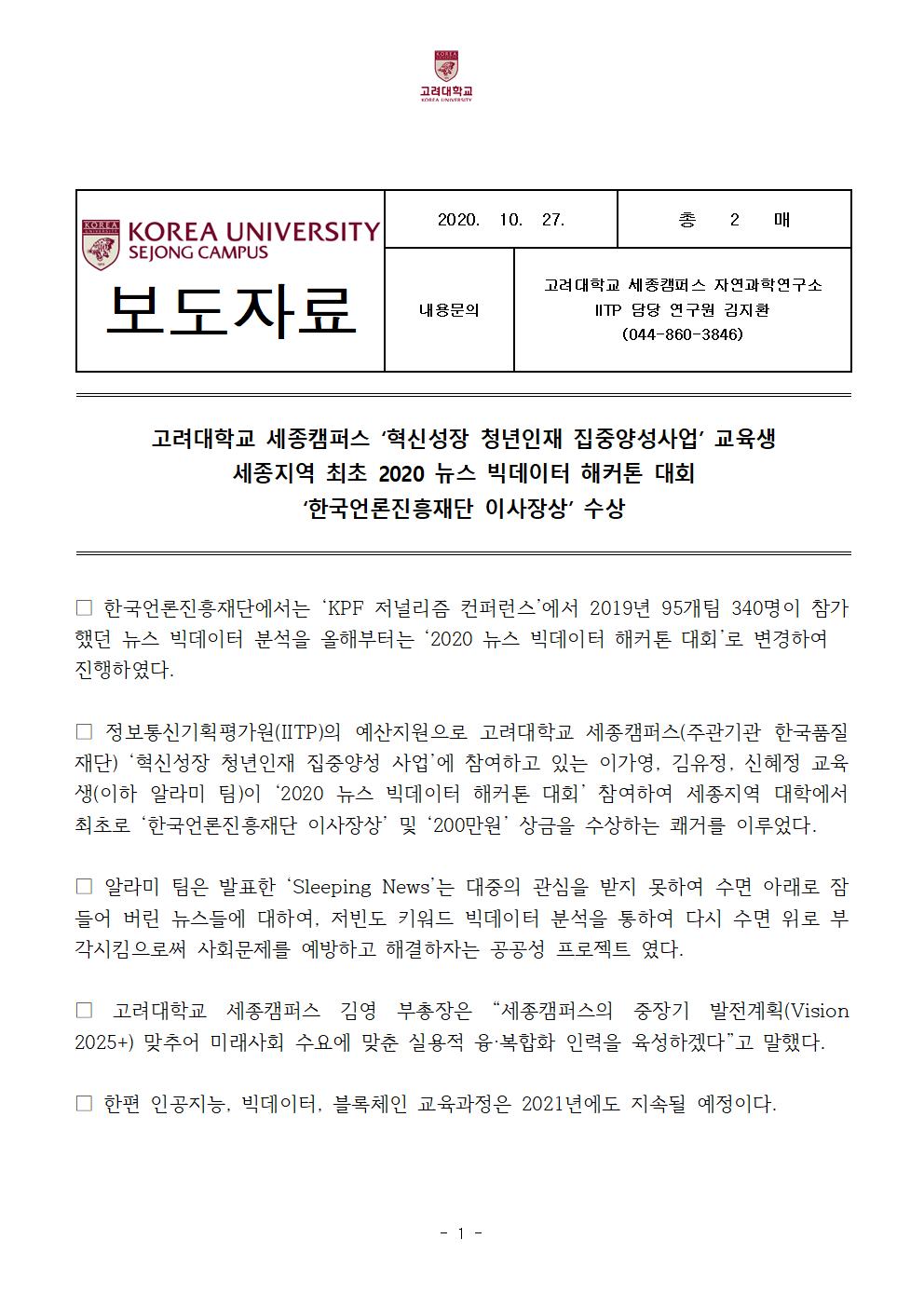 보도자료)세종지역 최초 2020 뉴스 빅데이터 해커톤 대회 '한국언론진흥재단 이사장상' 수상