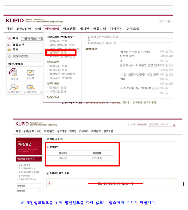 2) 학적/졸업 → 합격내역조회 클릭
