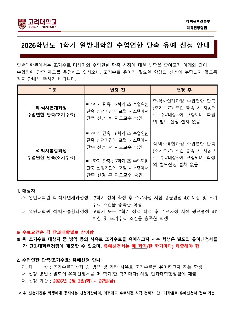 | 903 | [대학원]2026학년도 1학기 수업연한 단축 유예 신청 안내문 | 식품생명공학과 | 2026.02.26 | 0 | 22 |