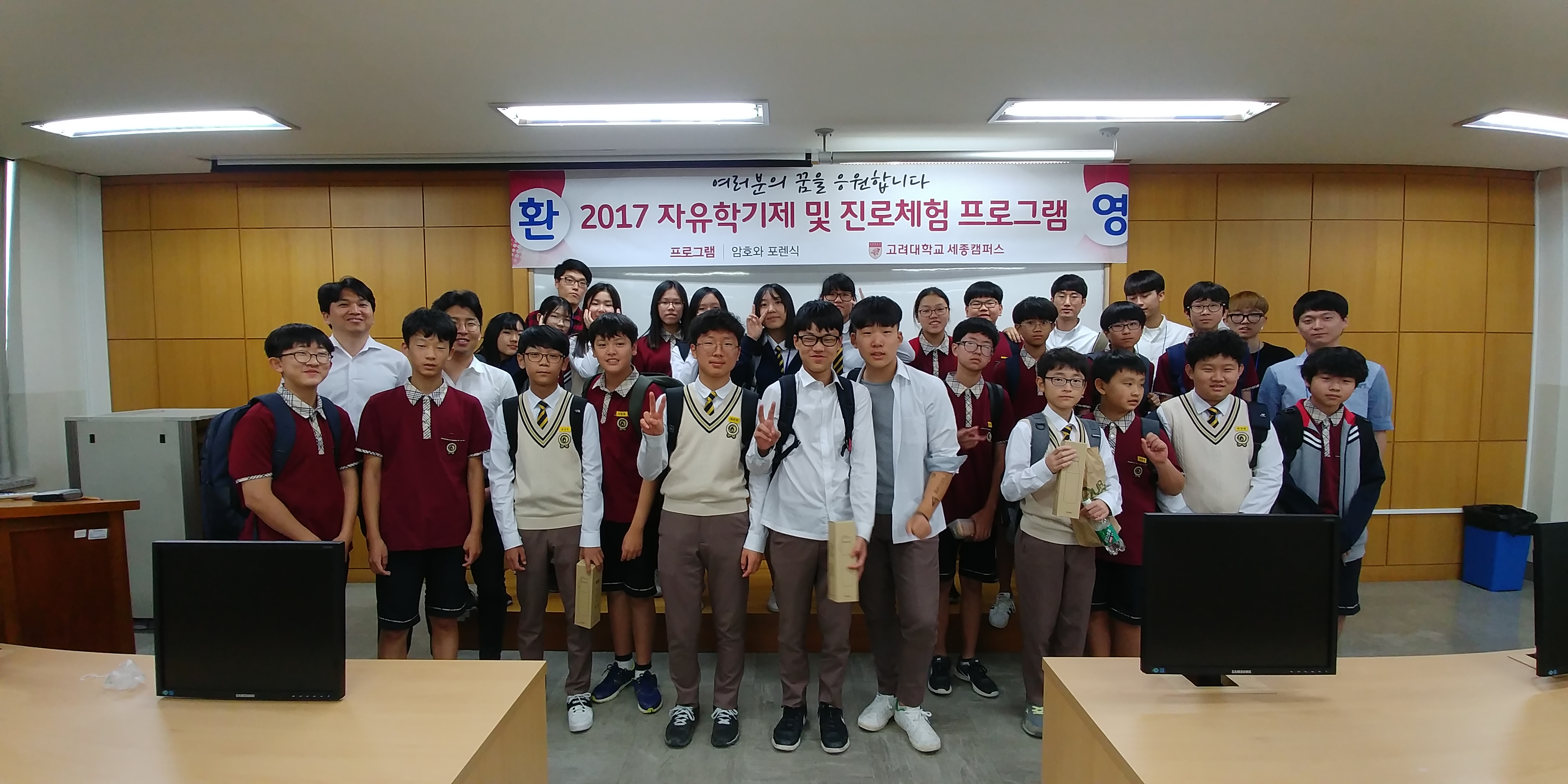 2017년 9월 15일 지역 맞춤형 진로체험 프로그램(프로그램명 : 암호와 포렌식)에 세종시 새롬중학교 1학년 학생들과 보안에 대한 중요성과 해킹 시연 및 고전암호 만들기르르 통해 사이버보안에 대한 이해를 높이고 관심을 갖는 계기가 되었습니다.