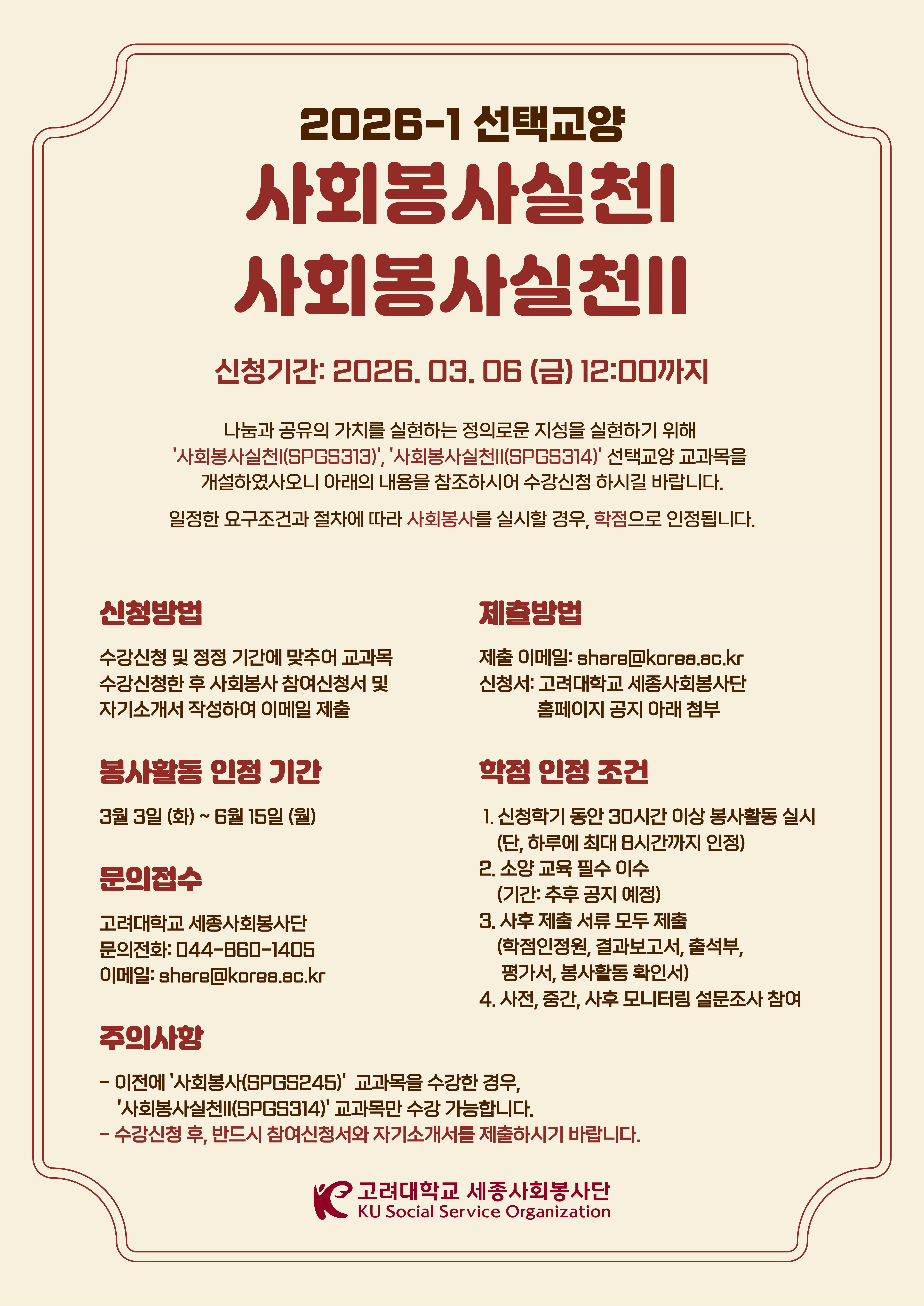 2026학년도 1학기 선택교양 '사회봉사 실천Ⅰ(SPGS313)', '사회봉사 실천Ⅱ(SPGS314)' 수강신청 안내