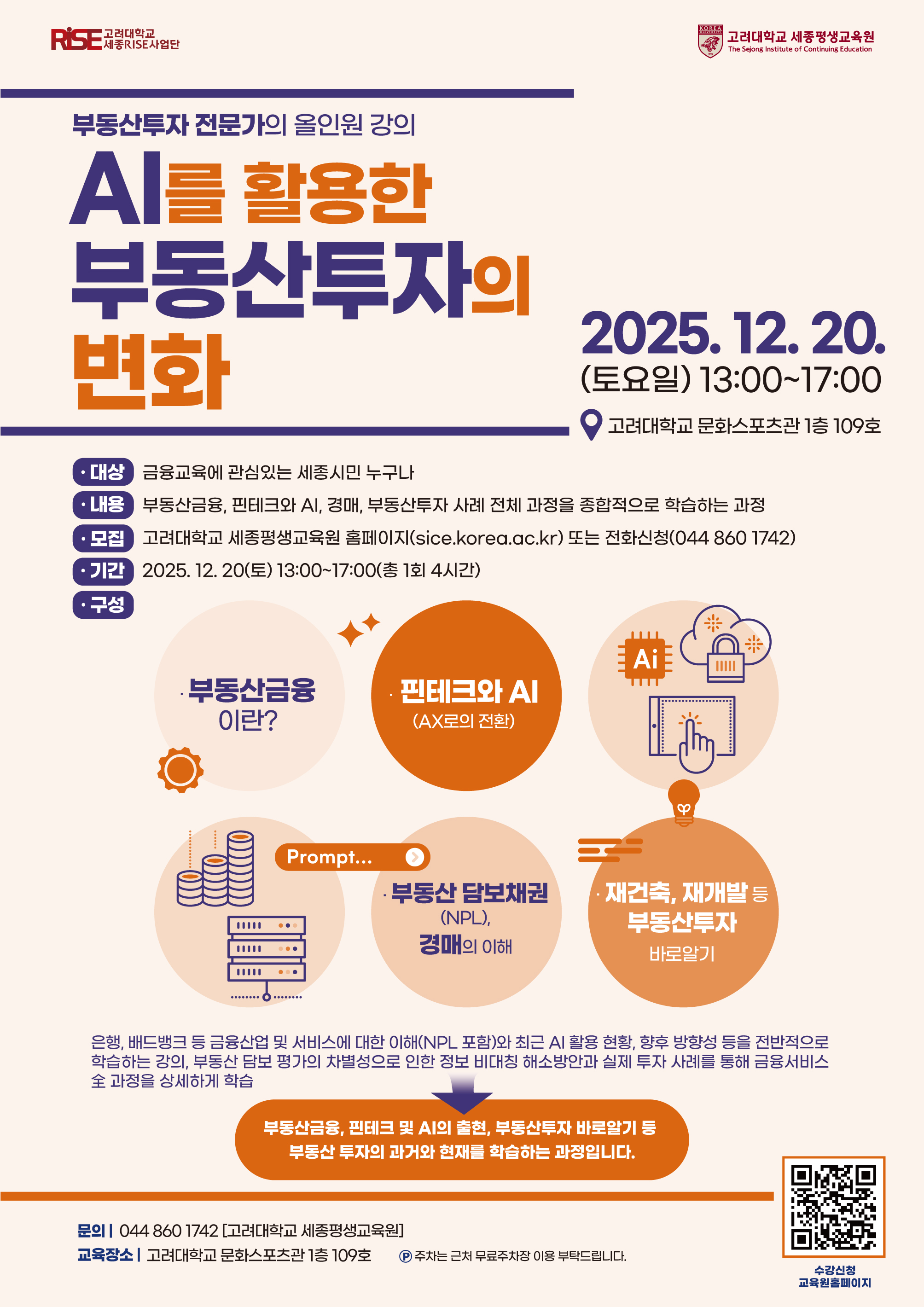 • 홈페이지(https://sice.korea.ac.kr) [홈페이지 : 교양강좌 → 수강신청 → 강좌선택 후 신청] • 전화 044-860-1741~2 • 방문 세종특별자치시 세종로 2511 고려대학교 세종캠퍼스 문화스포츠관 511호