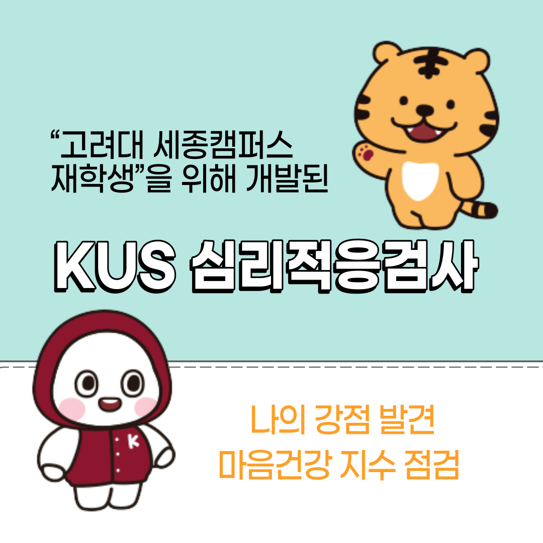 KUS 심리적응검사는 고려대학교 세종캠퍼스 재학생의 고유 특성을 반영하여 개발한 검사입니다. 건강한 대학 생활에 도움을 주는 긍정적인 강점과 심리적 건강을 확인할 수 있습니다. 개인의 마음건강 지수와 강점을 찾고, 1:1 상담 또는 나에게 도움이 되는 다양한 프로그램을 확인해보세요. 쿠세움(KUSEUM) 역량관리 심리적응검사