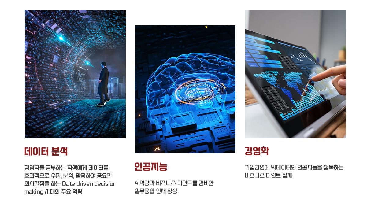 - 디지털경영전공은 다양한 배경을 가진 학생들이 모여 함께 성장하는 곳입니다. 전공과목은 프로그래밍과 데이터 분석에 필요한 기초 개념과 실습을 체계적으로 학습하도록 구성되어 있습니다. 때문에 문과 출신이더라도 열정과 노력으로 데이터 분석과 프로그래밍을 익힐 수 있습니다. 빅데이터와 인공지능의 기초를 익히고 기업 경영에 활용하는 방법을 익힌다면 여러분 앞에는 성공을 위한 무한한 가능성이 열릴 것입니다. 배우고자 하는 의지가 있고, 열정이 넘치는 모든 학생을 환영합니다.