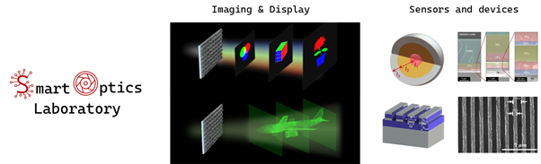 고려대학교 스마트 광학 연구실(Smart Optics Lab, SO Lab)은 우리 삶을 혁신할 수 있는 영상 및 이미징 소자, 디스플레이, 센서 등 다양한 나노 광학 소자를 개발하고 있습니다. 본 연구실에서는 의료, 통신, 모빌리티, 항공 우주 등 다양한 산업에서 활용될 수 있는 스마트 광학 소자를 개발하기 위해 최신 나노 광학, 인공지능의 기술을 활용하고 있습니다. 스마트 나노 광학 연구실에서는 광학 소자를 개발하기 위한 최적 설계 연구에 주력하고 있으며, 다양한 광학 소자의 초소형화 및 신개념 광학 소자의 개발을 목표로 합니다.